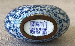 Of compressed ovoid form, the white body intricately enamelled in blue with feathery arabesques on a speckled ground.