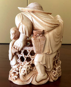 A superb Chinese ivory carving of a fisherman dressed in a tied half robe, a straw hat on his head, a carry basket at his waist.