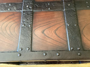 Faced with hand forged hand beaten iron on all the corners and side sections, an iron central medallion for the key lock bearing the character Fuku 福meaning good fortune and happiness.