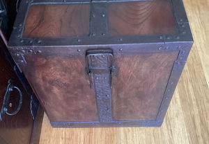 Top: A two handled drop pull single drawer. Head beaten hand forged iron corners.